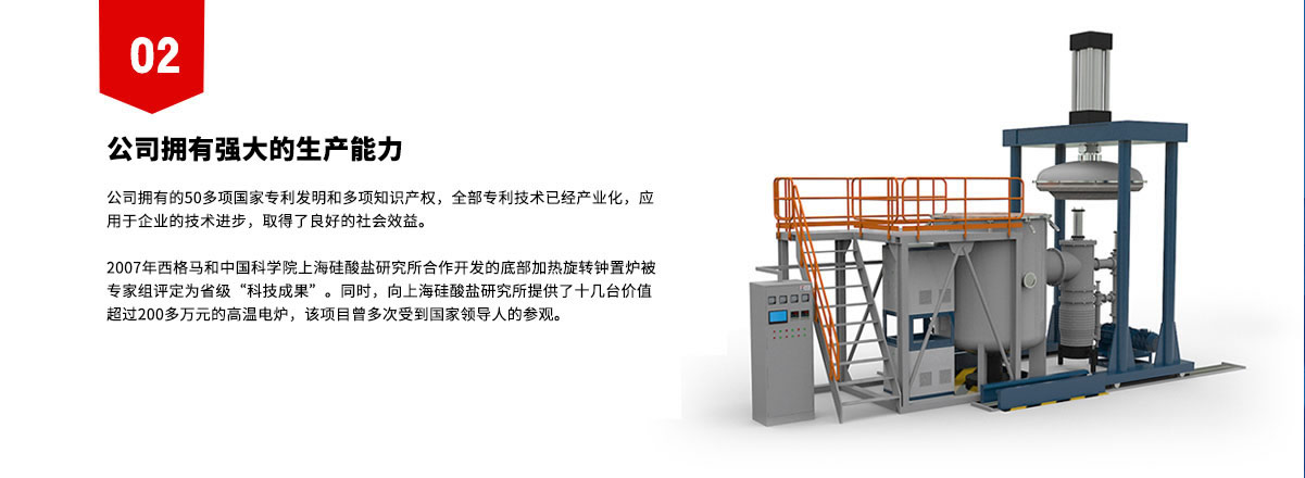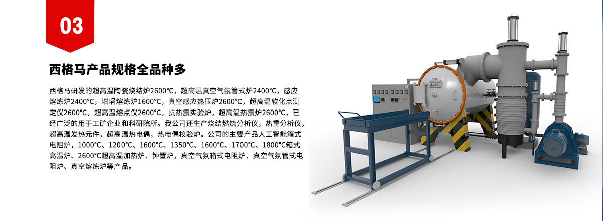 ●行業定位:高端制造業、新材料、保溫材料   ●企業定位:西格馬企業集團是以超高溫科技、高端設備制造、新材料、建筑保溫材料等產品研發、制造、銷售以及提供高溫領域系統解決方案和服務為主的高新技術產業集團。   ●主要產品和服務:   1、巖棉加熱電爐生產線設備、危廢玻璃化生產線設備、電加熱石   灰窯生產線設備、固體燒結爐自動化生產線設備;   2、實驗電爐、通用工業電爐、真空熱處理爐、真空燒結爐、真空熱壓燒結爐、鋁合金空氣循環淬火爐、鈦合金熱壓成型機;   3、超高溫發熱體、超高溫傳感器、超高溫電爐;   4、建筑外墻防火保溫巖棉板及保溫材料;   5、高端耐磨材料、功能材料、特種耐火材料;   6、藍寶石晶體材料及藍寶石手機屏;   7、超高溫領域系統解決方